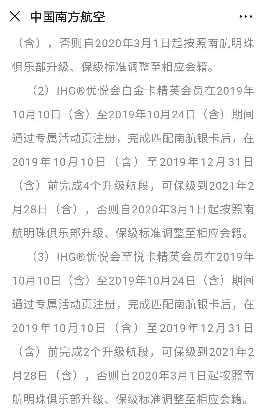 · IHG? 优悦会符合参与资格的金卡、白金卡和至悦精英会员在2019年10月25日至2019年12月31日期间通过专属活动页登记并完成审核,可匹配相应的南航明珠会籍,有效期至2020年2月29日(含)。若在2019年10月10日(含)至2019年12月31日(含)期间完成6个升级航段,且达到升级里程6,600公里,可保级至2021年2月28日(含),否则自2020年3月1日起按照南航明珠俱乐部升级、保级标准调整至相应会籍。