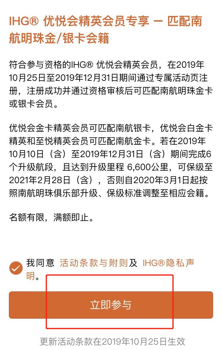 符合参与资格的IHG优悦会精英会员,在2019年10月25日至2019年12月31日期间通过活动注册,注册成功并通过资格审核后可匹配南航明珠金卡或银卡会员。