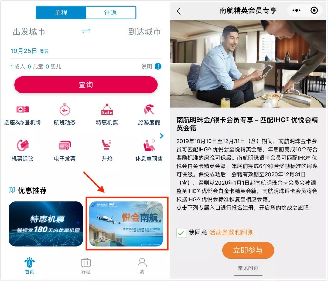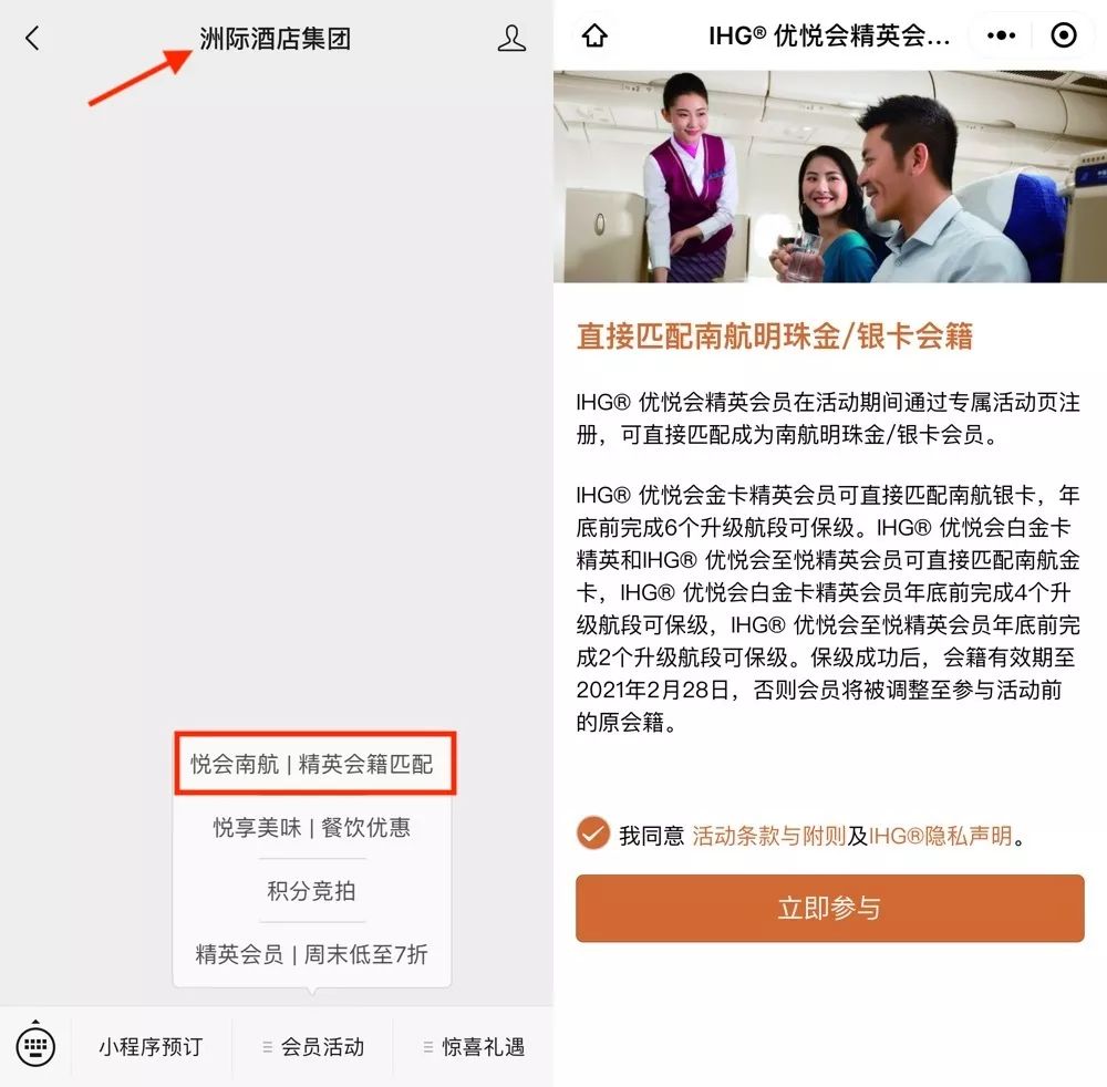 搜索进入微信公众号“洲际酒店集团”,在菜单栏下方“会员活动”中,点击“悦会南航|精英会籍匹配”,即可参与。