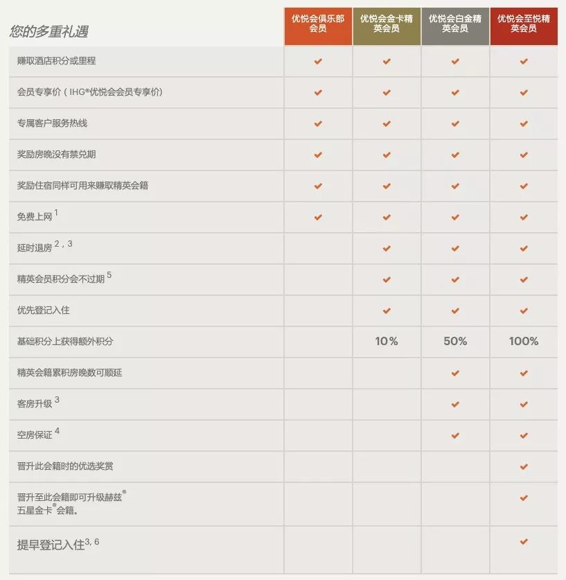 优悦会白金卡会员可以享受延时退房、客房升级、客房迎宾小食等权益,至悦会员还能进一步享受提早登记入住、餐饮代金券,行政酒廊等非凡礼遇。进阶玩法是你还可以用IHG的会籍match到其它酒店的高级会员,顺便把其它酒店的优惠也一网打尽,real方便!