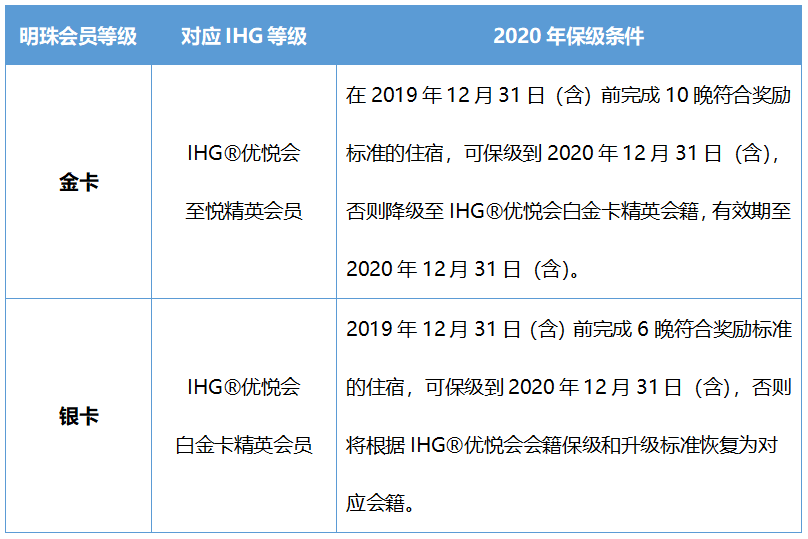 匹配的会籍有效期到今年年底,如果你想要延长会员权益的话,IHG金卡、白金卡、至悦精英会员只需要在12月31日前,有6个航段且6600公里的升级里程,就可以保级到2020年12月31日!平时的升级银卡都是需要4万公里或者20个航段的!
