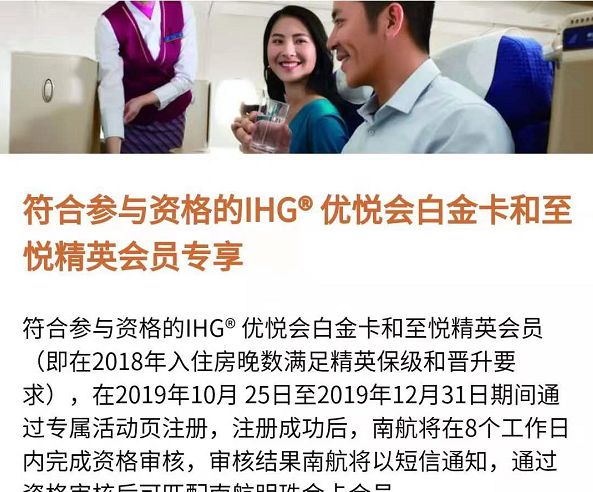 符合参与资格的IHG优悦会精英会员,在2019年10月25日至2019年12月31日期间通过专属活动页注册,注册成功并通过资格审核后可匹配南航明珠金卡或银卡会员。优悦会金卡精英会员可匹配南航银卡
