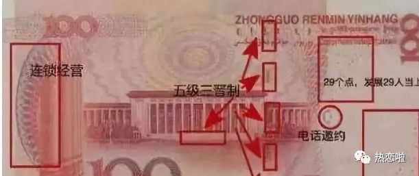 五根柱子:传销人员解释为五级三晋制。现实情况是在1998年,东南亚受到“中国威胁论”的影响,为了应对中国的崛起,发生了全球性的大规模的“东南亚排华事件”,,时任总理的朱**总理重申了“和平共处五项原则”,并把这个作为中国在东南亚经济发展的基本国策。所以根据这个指示,在1999年发行的百元大钞就加入了五根柱子,其寓意是“和平共处五项原则作为中国在东南亚发展的支柱”,就因为这五根柱子的图案表明了中国和平崛起的决心,因此,中国在后来2000年加入世贸组织时很顺利的加入了,东南亚看到中国的和平决心后也放弃了对中国的敌视,这也是为什么第五版的人民币在东南亚能通用的原因。