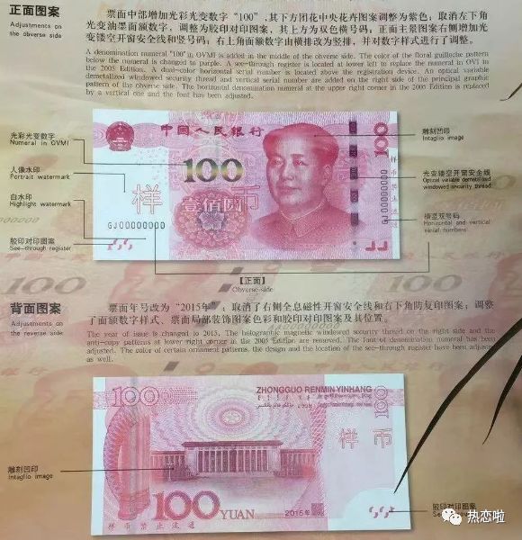 领导人的扣子:从1999版的100元人民币“平行线”变成2005版“叉型”,说明原来是600份等于600人,到现在的600份不等于600人。现实情况是人民币刻板人不是同一人,难免出现有差别。