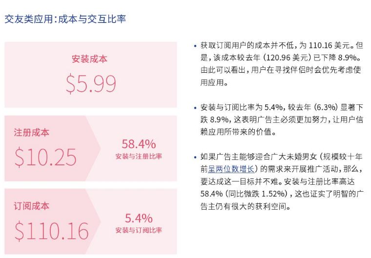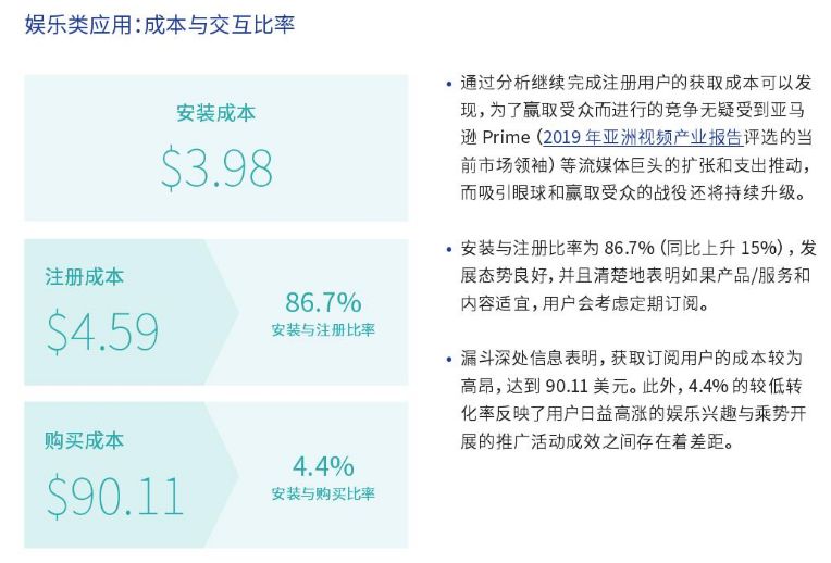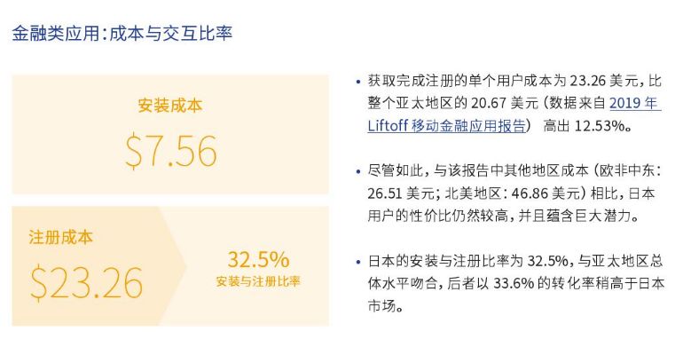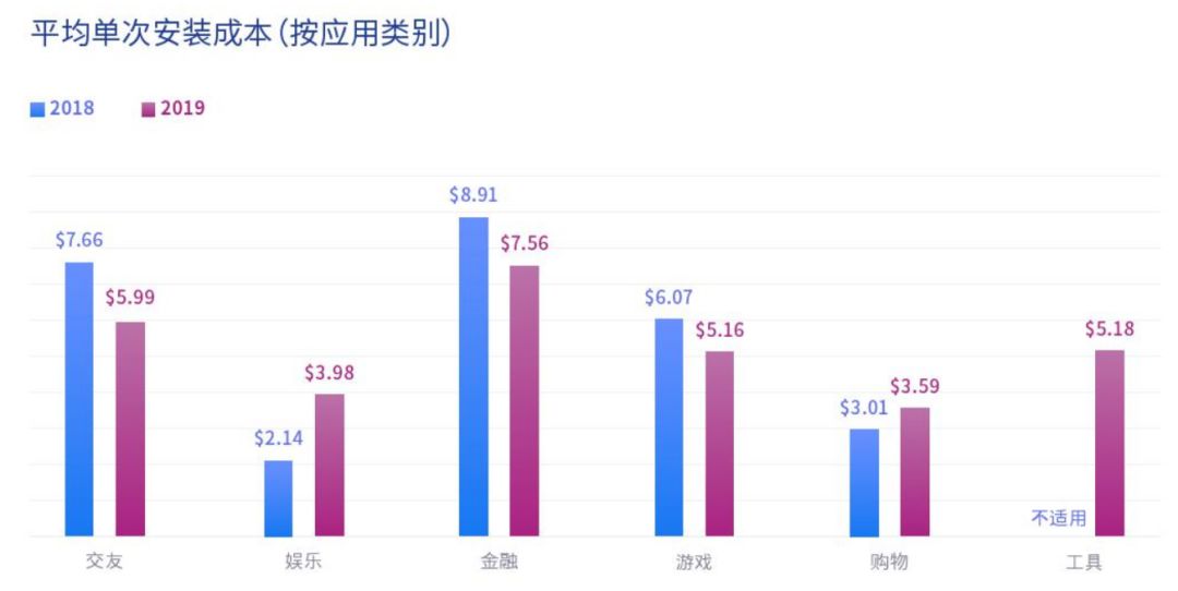 随着移动应用交互量的提升,获客成本也水涨船高,娱乐类应用获取单个用户的成本涨至3.98美元,较18年上涨了86%,同样上涨的还有购物类移动应用,加之金融类移动应用获客成本下降,移动购物带动移动支付,是日本推进非现金支付的绝佳时机。交友类移动应用较去年下跌了21.8%,时间紧缺的用户不愿花费大量时间去交友,简化交友过程的应用将会更受欢迎。