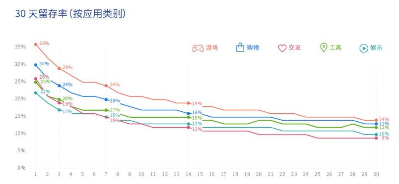 工具和交友类应用一开始表现良好,3-14天二者走势趋同,表明两类应用在留存率方面具有持久性,但在后期二者逐渐拉开差距,交友类应用的用户留存率仅为9%。