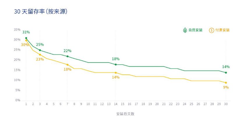 日本用户对于自己甄选的应用忠诚度更高,付费推广的应用在前期与自然安装的应用差距并不大,但在第30天二者相差5%,付费推广虽是一个不错的吸引、留存用户的渠道,但仅靠广告推广显然不够,要时刻与用户保持紧密的联系才能获得更好的推广效果。