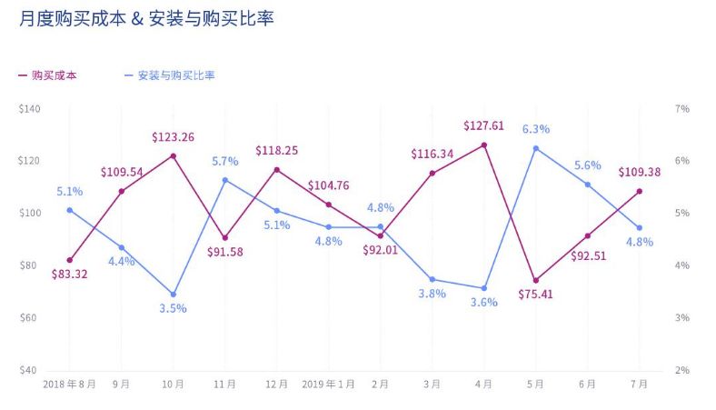安装与购买比率比去年平均增长了4.8%,用户逐渐开始在应用内消费。5、6、7三个月是获取高交互用户的重要月份,用户会在这三个月里收到奖金,庆祝节日或计划旅行,在这三个月内可以较为合理的成本获取更多的高交互用户。