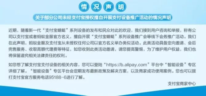 据支付宝商家中心解释,这类活动具备定向邀请、会后兜售服务、收取高额代理费等特征,如有接到邀请,请提高警惕,想了解支付宝刷脸设备,可直接到官网咨询或电话咨询。移动支付两大巨头纷纷点名刷脸支付加盟骗局,主要是因为支付市场上冒充支付宝、微信支付的诈骗活动太过于猖狂。有服务商向「热浪财经」透露,有些空壳公司买几台刷脸设备,线上依靠QQ、微信群进行推广邀约,线下以刷脸设备推介会、刷脸支付商机交流会等形式进行诈骗,在宣传上常以“万亿级别市场”、“支付新风口”、“颠覆性创新项目”等噱头吸引加盟。