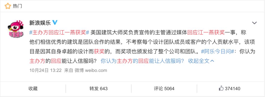 昨天,江一燕的“翻车“事件又有了新的进展,继获奖者本人亲自回应后,美国建筑大师奖的主办方也对江一燕的本次获奖做了些许解释。