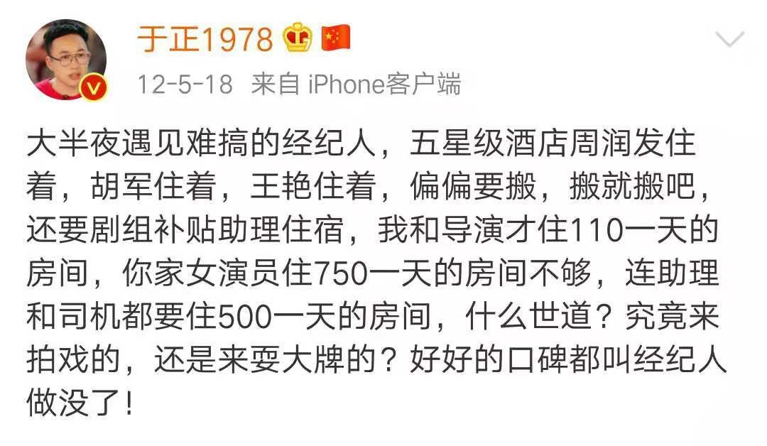 一次,于正在微博上吐槽,某女演员经纪人特别难搞,于正与导演住着110元一天的房间,而女演员住着750元一天的房间不算,还要求助理和司机都要住在500元一天的房间