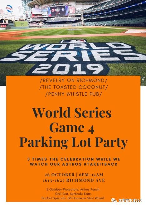 我们提供30台电视机,两台投影机,停车场里还有一个20英尺高的充气屏幕,所有的一切都是为了看这场大比赛。将会有15美元的Domestic Bucket,20美元的Houston Bucket,以及每次休斯顿太空人队打出全垒打都会有5美元的shot wheel。我们将在外面烤椰子,并提供自己的休斯敦太空人Punch。