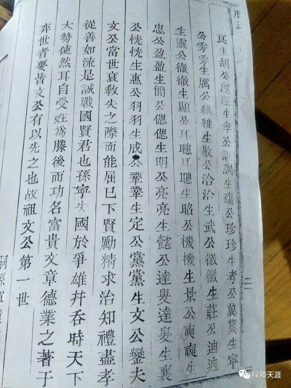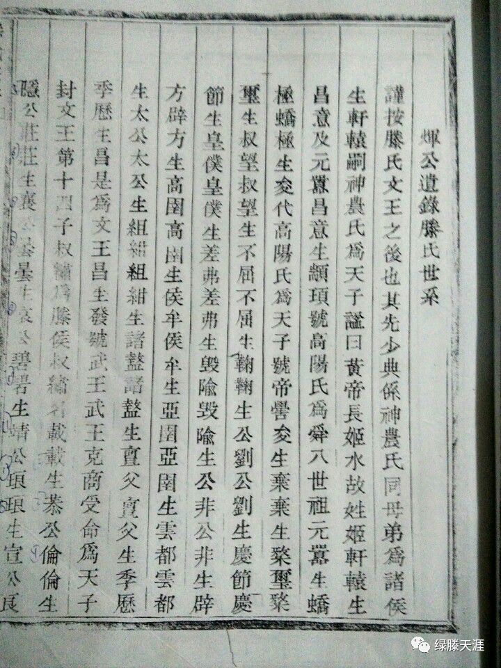 谨按滕氏文王之后也,其先少典,係神农氏同母弟,为诸侯,生轩辕,嗣神农氏为天子,谥曰黄帝,长姬水,故姓姬。轩辕生昌意及元嚣,昌意生颛顼,号高阳氏,为舜八世祖。元嚣生蟜极,蟜极生夋,代高阳氏为天子,号帝嚳。夋生棄,棄生璽玺,璽玺生叔望,叔望生不窋,不窋生鞠,鞠生公刘,公刘生庆節,庆節生皇僕,皇僕生差弗,差弗生毁隃,毁隃生公非,公非生辟方,辟方生高圉,高圉生侯牟,侯牟生亚圉,亚圉生云都,云都生太公,太公生祖紺,祖紺生诸盩,诸盩生亶父,亶父生季厯,季厯生昌,是为文王。昌生发,号武王,武王克商,受命为天子。封文王第十四子叔绣为滕侯,叔绣名载,载生恭公倫,倫生隐公荘,荘生襄公曇,曇生袁公碧,碧生靖公琅,琅生宣公良,良生胡公涇,涇生孝公训,训生殤公珍,珍生考公冀,冀生宁公雱,雱生厲公维,维生敬公洽,洽生武公徽,徽生莊公迪,迪生靈公徹,徹生顯公耳聪,耳聪生昭公机,机生景公奭,奭生忠公盈,盈生简公偲,偲生明公亮,亮生懿公达叟,达叟生襄公恍,恍生惠公羽,羽生成公鞏,鞏生定公黨,黨生文公鑾。夫文公当世,衰教失之际,而能屈巳屈下贤,勵精求治,知礼盡孝,從善如流,是诚戰国贤君也。孙宁失国,於争雄并吞时,天下大势使然耳。自受姓为滕后,而功名富贵文章德业之著于奕世者,要皆文公,有以先之也,故祖文公第一世。
