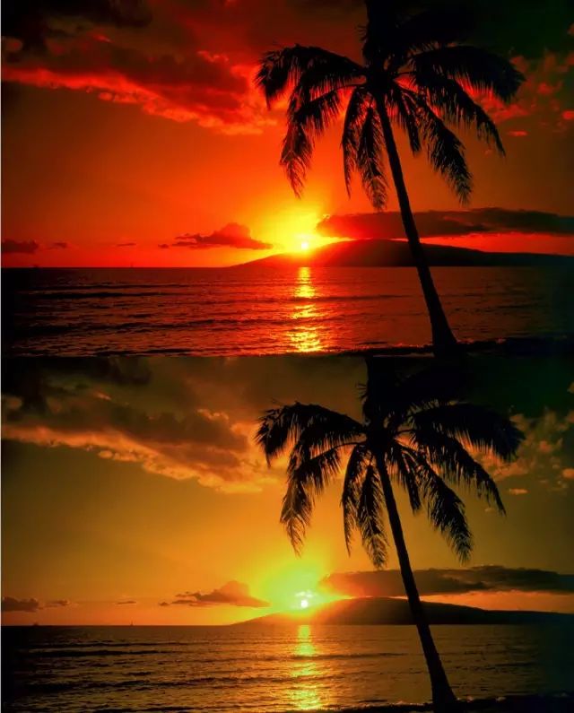 如图所示,拍摄落日时,自动白平衡部分消除了色温最高的红橙色光,与落日照的拍摄需求背道而驰。