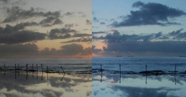 下图是个实例,开启自动白平衡拍出的左图中,海水呈灰色,而现实中的颜色则如右图所示。
