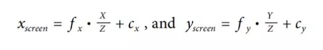 其中,cx、cy是坐标中心偏移引入的两个新参数,fx、fy是引入的两个不同的焦距,此处焦距fx实际上是透镜的物理焦距长度与成像装置每个单元尺寸Sx的乘积(Sx的单位为像素/每毫米,f的单位是毫米),这样做的目的是,Sx、Sy以及物理焦距 f 均不能在相机标定过程中直接测量,只有组合量fx = f * Sx,fy = f * Sy 可以直接计算出来,避免拆除相机去直接测量其部件。求得的(xscreen, yscreen)是像素坐标。