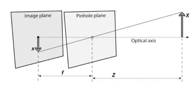 我们可以看最简单的相机模型:针孔模型,针孔模型,如下图,f是相机焦距,Z是相机到物体的距离,X是物体的长度,x是图像平面上的物体图像。根据相似三角形可以得到公式:
