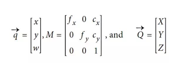 用一个三维向量q = (q1, q2, q3)来表示平面上的点,由于所有点在投影空间中的比例值是相同的,因此我们可以通过除以q3得到实际的像素坐标值。这样一来,便允许我们将定义相机的参数(如fx, fy, cx, cy)重新排列为一个3 * 3的矩阵,称为相机的内参矩阵。
