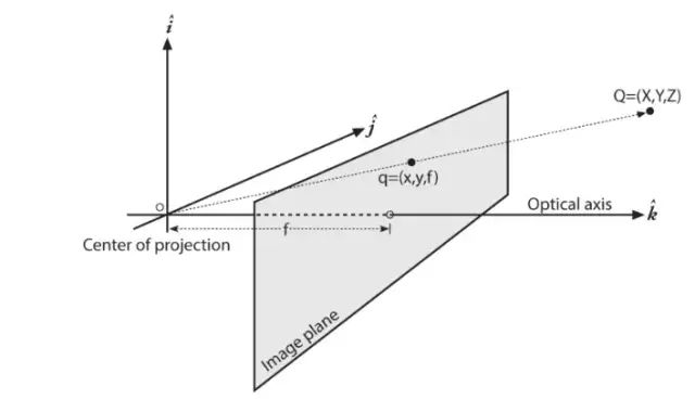 将物理世界中坐标为(X, Y, Z)的一系列物理点Q映射到投影平面上坐标为(x, y)的点的过程叫射影变换。采用这种变换一般要使用齐次坐标。