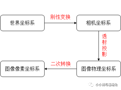 简单的说,摄像机成像过程的实质是4个坐标系的转换,首先,空间中的一点由世界坐标系转换到相机坐标系,此时的点仍处于空间;然后将空间的点投影到成像平面上,完成相机坐标系转换到图像物理坐标系,此时的点已经投影到成像平面,是个二维点;最后成像平面上的点转换成图像平面,此时点参考的坐标系变为图像像素坐标系。