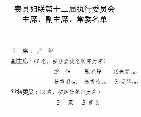 会议选举产生9名常委,选举尹娜同志为县妇联主席,彭伟、张晓静为副主席,赵姝雯为挂职副主席,杨秀丽、杨秀梅、孙百琴3名同志为兼职副主席,王京艳、王箴2名同志为常委。