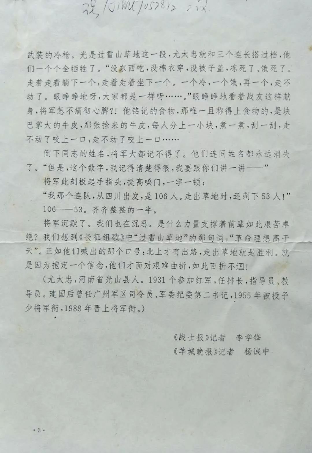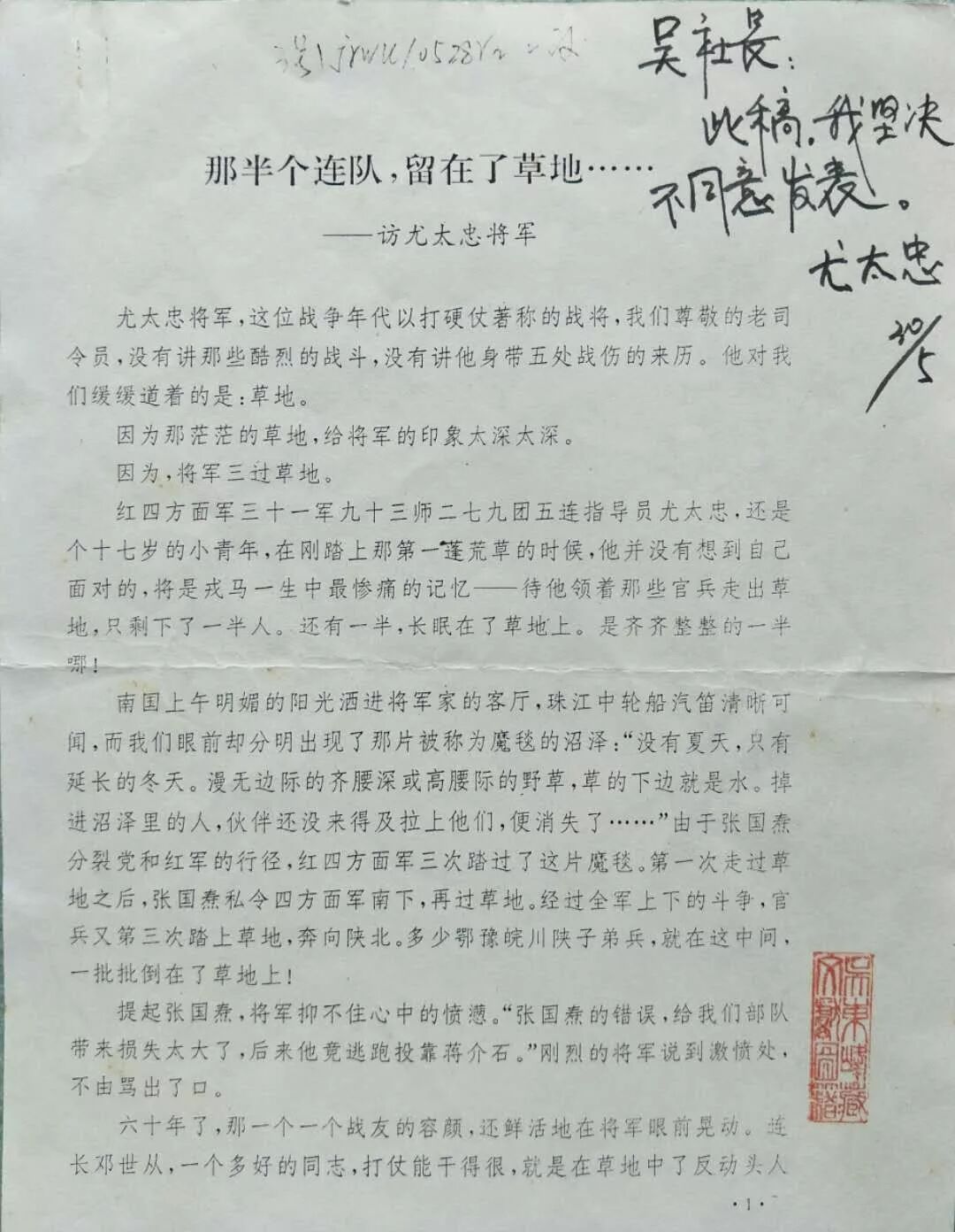 “我们四方面军是三过草地。第一次过草地,走到中间又返回去了,在四川南下,那时说,打下成都吃大米。这是两过。第三次又返回来,北上陕甘。我们走了三次啊,困难得很啊。过草地有的走一二十天,有的走半个月,有的走一个把月,红军到了陕北好多人开了小差,回去了,不干了。太艰苦了。”六十年了,那一个一个战友的容颜,还鲜活地在将军眼前晃动。在长征途中倒下的同志,将军许多都还记得,但有的姓名想不起来了,有的只记得绰号。他们连同姓名都永远消失了。“这个数字,我记得清楚得很,我要跟你们讲一讲——”将军板起手指头,提高嗓门,一字一顿:“我那个连队,从四川出发,是一百零六人。走出草地时,还剩下五十三人!”损失了齐齐整整的一半。尤太忠将军的记忆力十分惊人,但遗憾的是他晚年没有留下详尽的回忆。采访后,我们很快就写好了一篇专访,题目叫《那半个连队,留在了草地――访尤太忠将军》。按照惯例我把这篇文章送给尤太忠将军审阅,但万万没有想到,将军竟不同意发这篇稿子。6月1日,我收到了尤太忠将军对这篇稿子的批示,在打印稿的左上角空白处,将军用签字笔写道: 吴社长: 此稿,我坚决不同意发表。 尤太忠 5\30我百思不得其解,反复望着将军的批示默默发呆,确实弄不明白问题出在哪里?如果事实有误,还可以修改嘛;不同意发表就不同意发表,为什么还要加两个字――“坚决”。