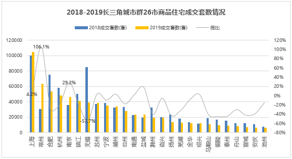 1. 成交量方面,2019年1-9月,长三角城市群26市商品住宅成交套数累计72.6万套,同比下降13.2%;26市中,仅8市较上年同期增长,其余城市均下降。其中上海成交10.4万套,居成交套数排行榜首,同比上涨4.2%;池州成交套数排名最低,成交6410套,同比下降14.5%。同比方面,常州以106.1%的翻倍增速领涨;无锡降幅最大,达到53.7%。究其原因,无锡2018年7-9月项目集中成交,市场热度较高,单月成交量过万套,尤其9月超过了2.6万套,从而导致同比量出现较大降幅。
