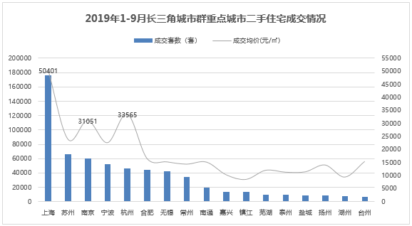 1. 成交量方面,2019年1-9月,重点监测的长三角城市群17市(详见说明)二手住宅累计成交套数61.8万套。该17市新房成交量为63.3万套,微高于二手住宅,一二手住宅成交量基本相当。根据17市新房成交量的占比预估,长三角26市二手住宅前三季度成交套数81.6万套左右。其中,上海以17.6万套的成交量遥遥领先,同比增长47.3%;苏州、南京以6万+的成交量分居二三位,同比分别增长32.1%、9.5%。台州成交量最低,不足7000套。