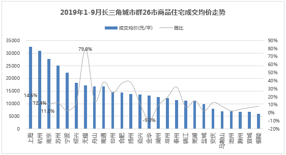 2. 价格方面,2019年1-9月,长三角城市群26市商品住宅成交均价18591元/平,同比上涨15.1%,涨幅较明显;26市中,除金华较上年同期有所下跌外,其余25市均有不同程度的上涨。其中上海商品住宅(含保障性住房)以32571元/平的成交价格居榜首,同比上涨14.6%(上海商品住宅不含保障性住房成交均价54139元/平,同比上涨6.8%);其次是杭州30910元/平;铜陵成交均价最低,为6018元/平。同比方面,无锡以79.8%的涨幅领涨;金华则下跌9.0%。