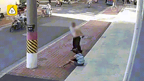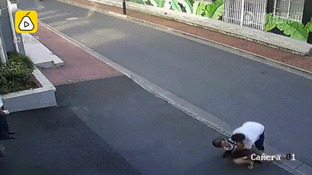 一位上了年纪的老阿姨在街上走着,后面一男子突然冲过来将她抱起,在空中狂甩。