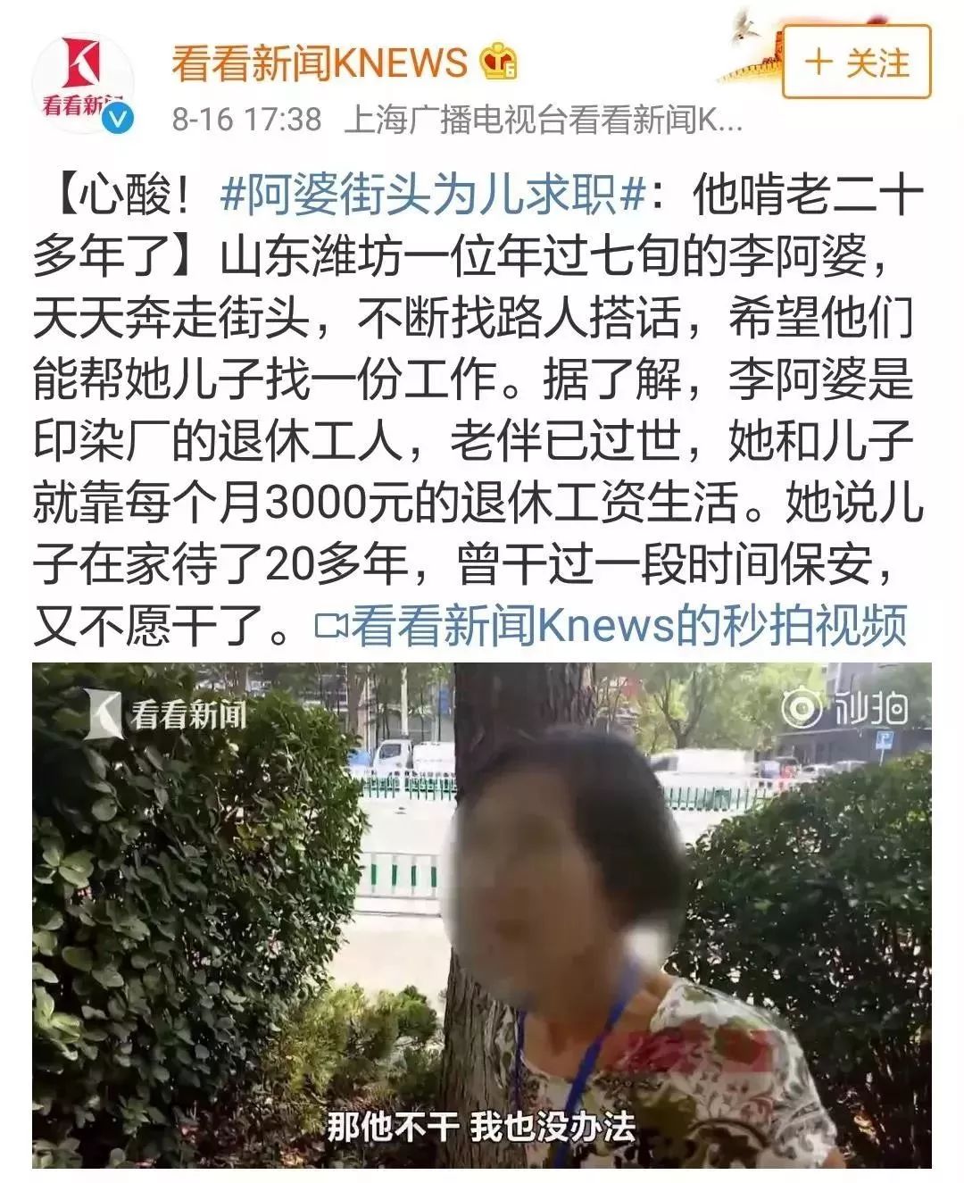山东一位70多岁的阿婆,每天顶着酷暑奔走于街头,只为帮儿子找工作。