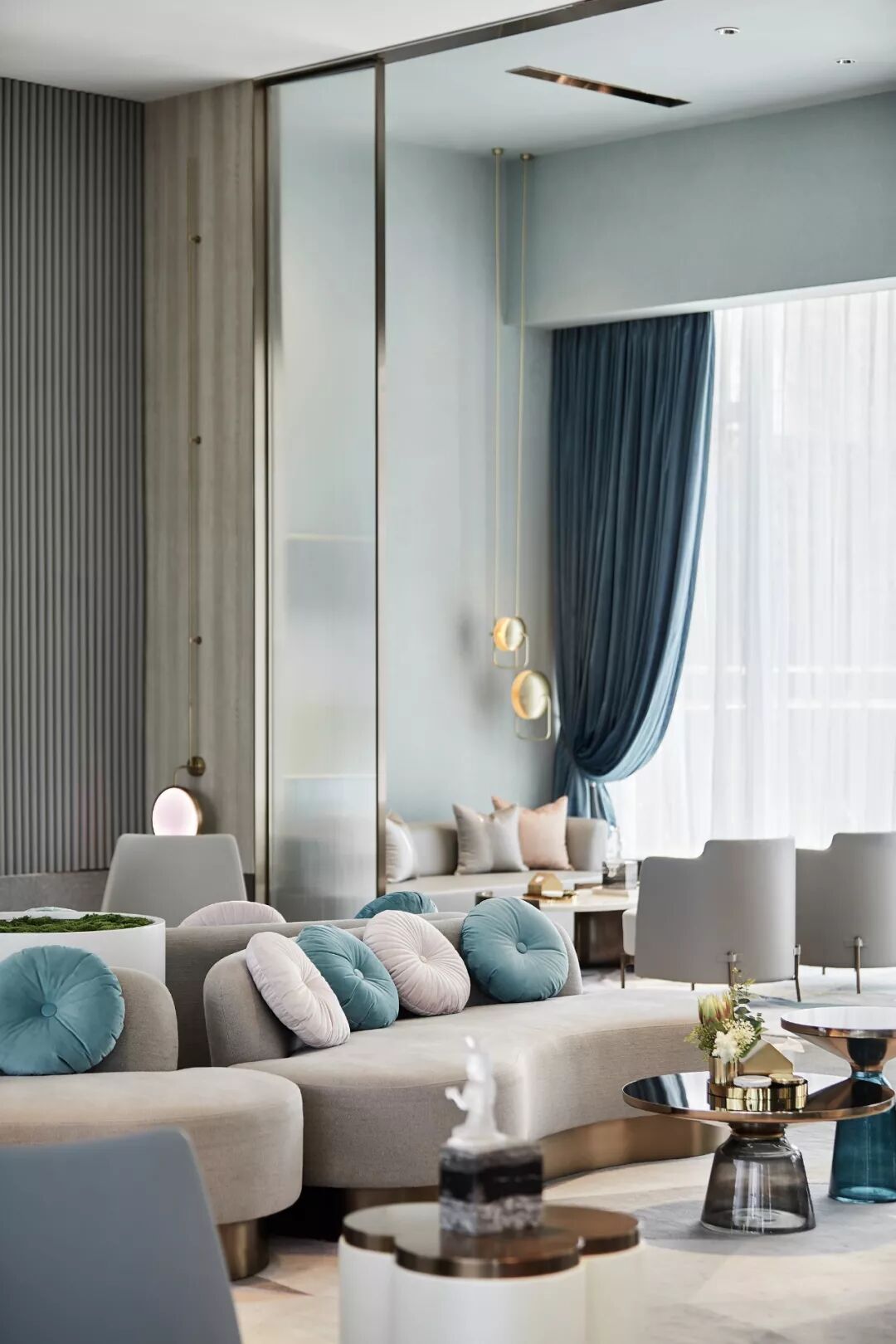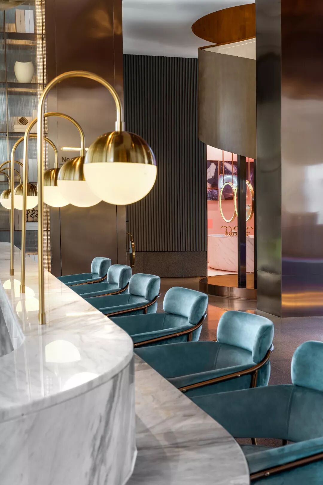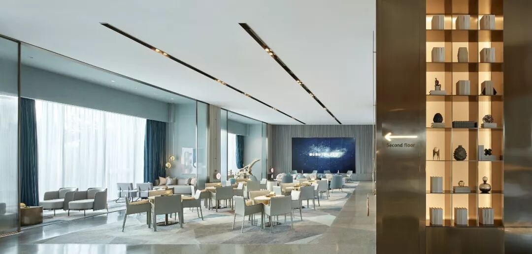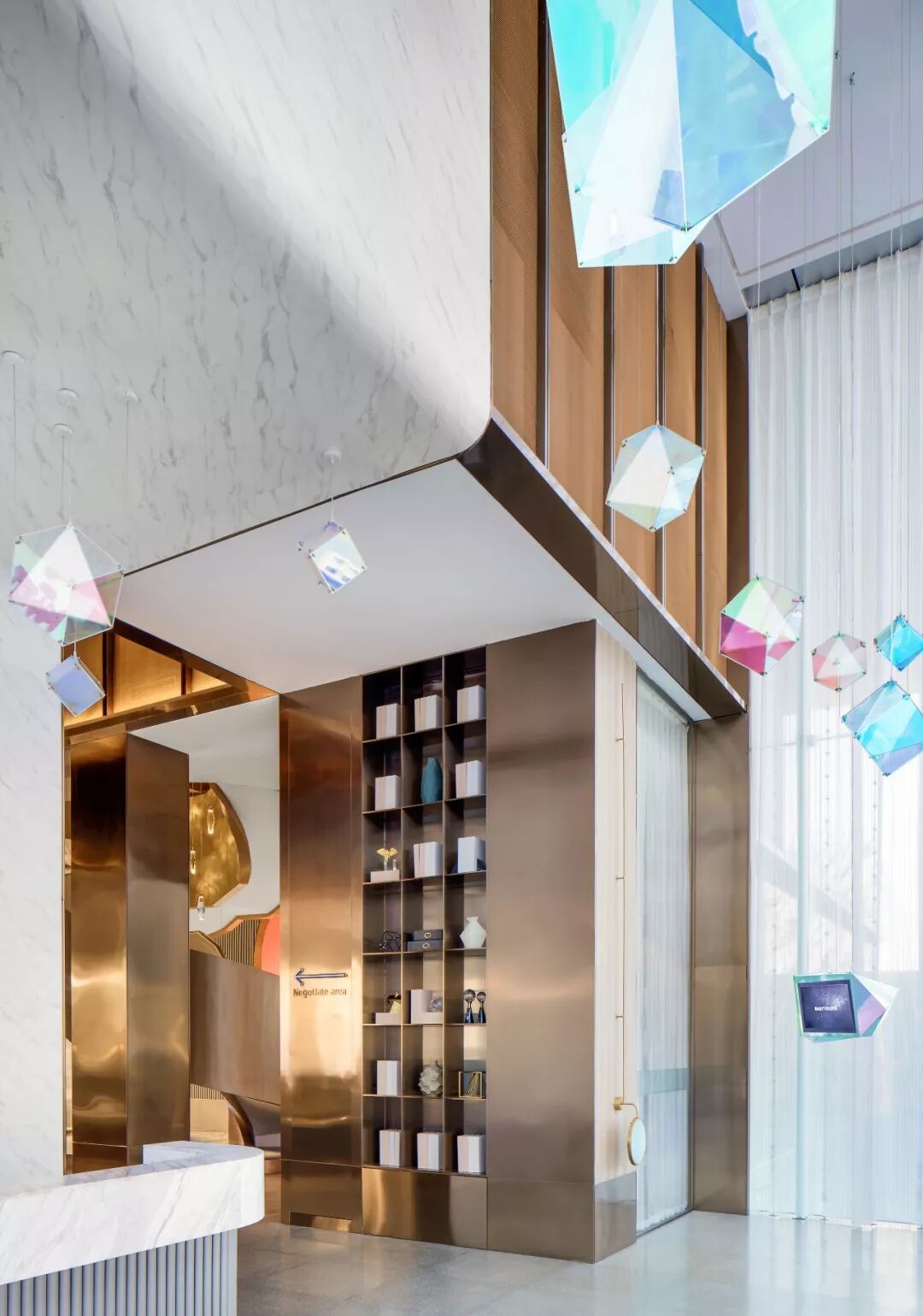 侧厅部分的材质分配的金属、皮质、织物传递更为精致的细节设计,艺术装置配合场域气质让体验美学在此实实在在的落地。