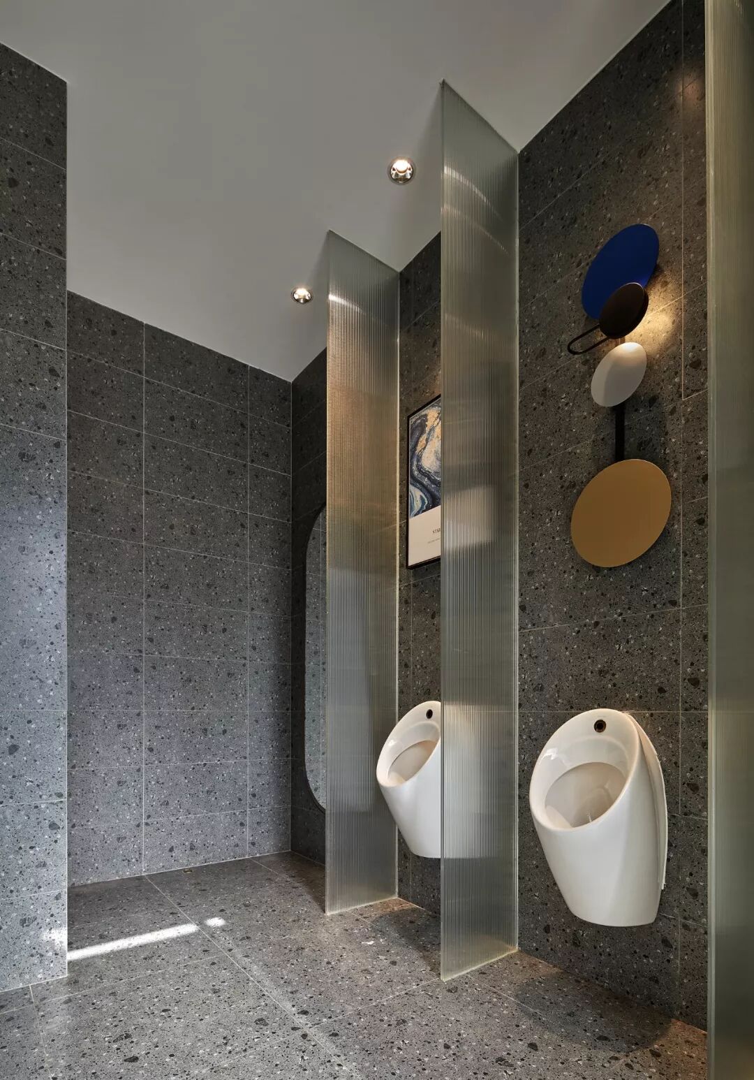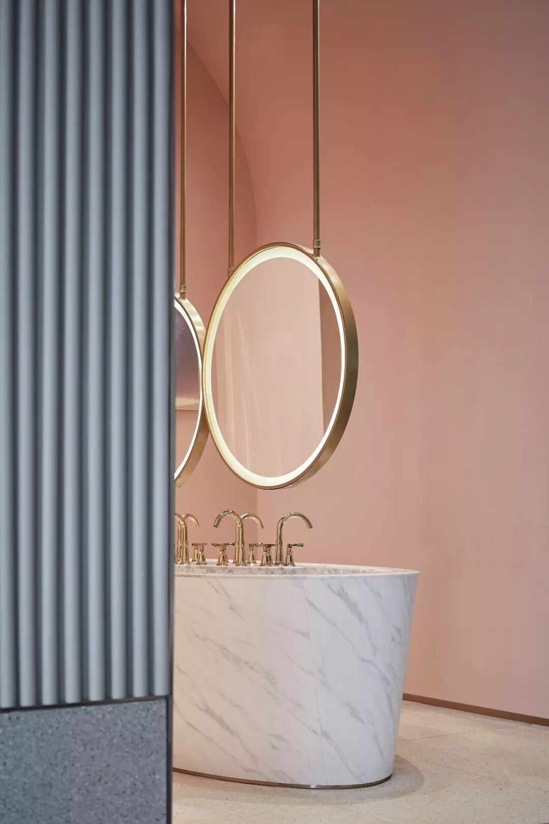 男女卫生间的共享区域色彩提取极光炫彩色系中的暖色系(珊瑚粉),点缀极少的冷色,确保温暖柔和的情感传递。