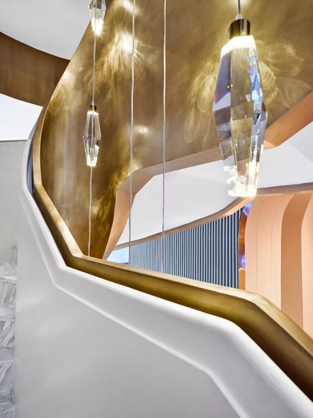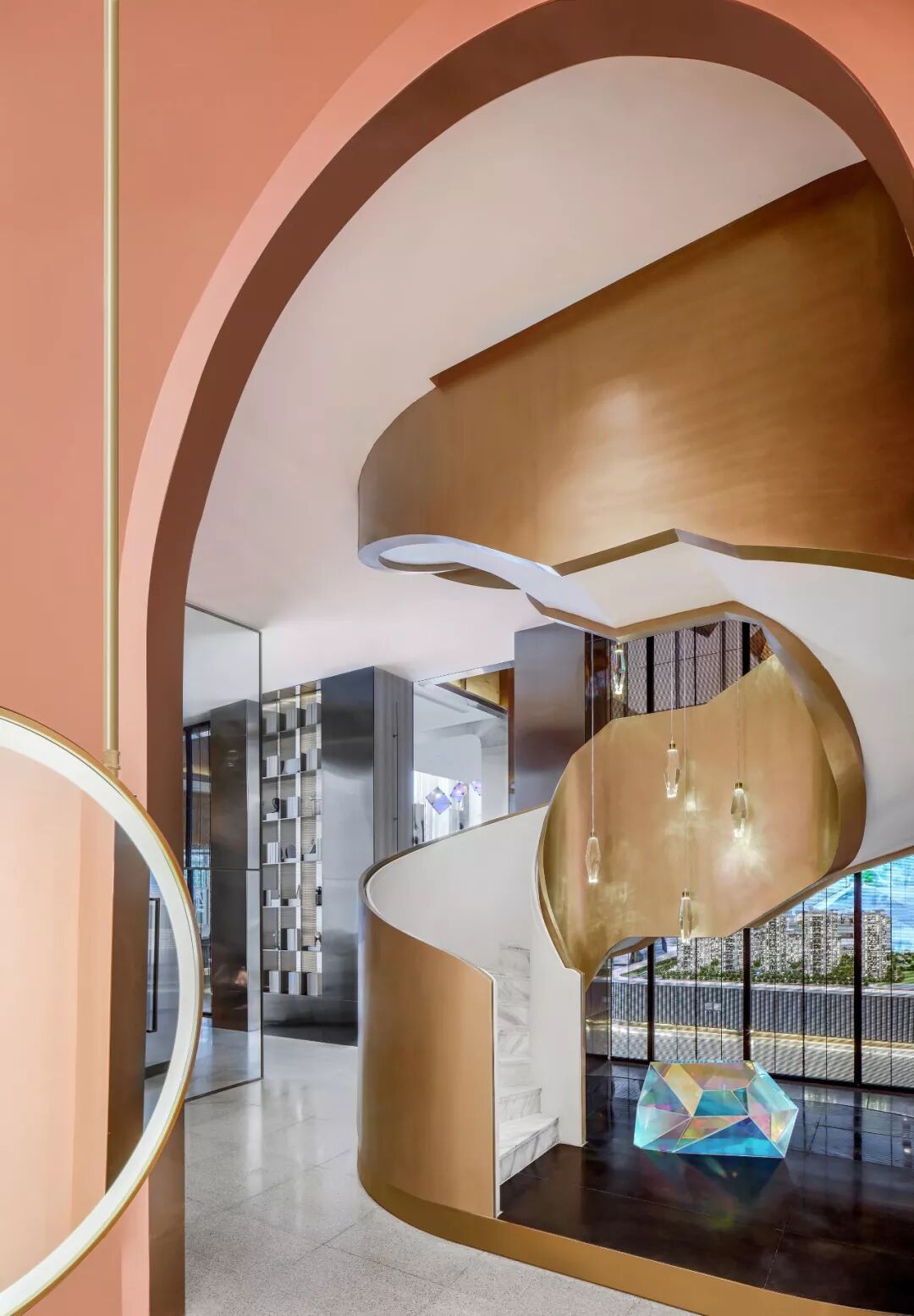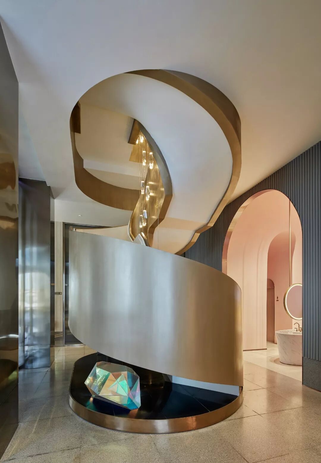 旋转梯设置在产品主展示区的中轴对景位置,是品质体现的核心,下部摆放的星体雕塑与吊灯上散落的钻石连成序列,沿梯而上,璀璨、绚烂、精致。
