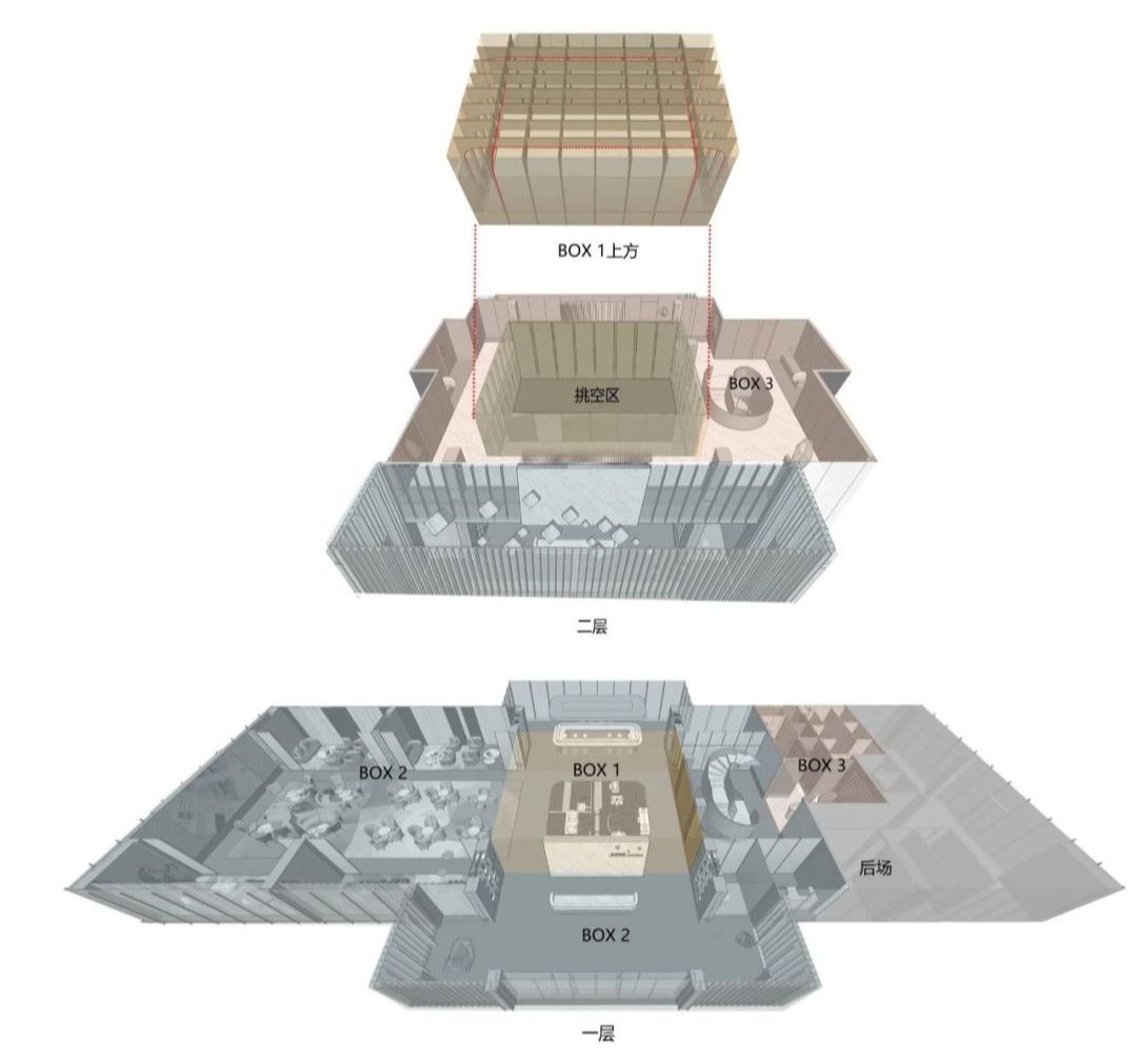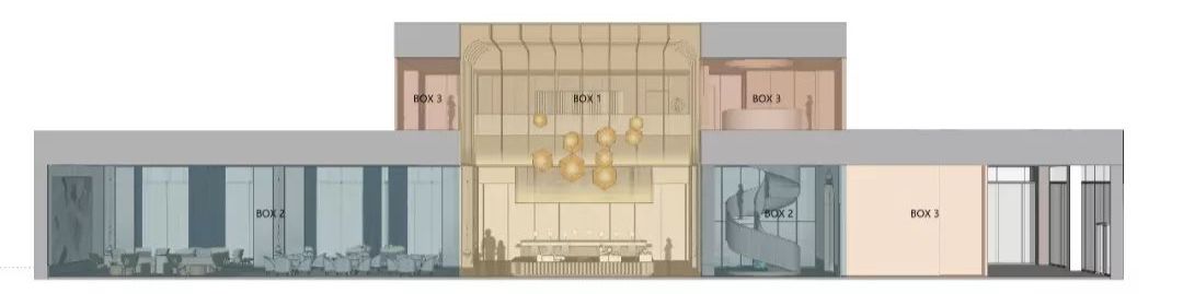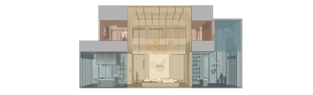 洽谈区与服务空间回归到側厅及半户外的灰空间,服务吧台的位置可以关照室内与半户外的功能,洽谈部分主色调提取极光炫彩色系中的冷色系(蓝紫),点缀极少的暖色,以确保能够让客群更专注的倾听感知。