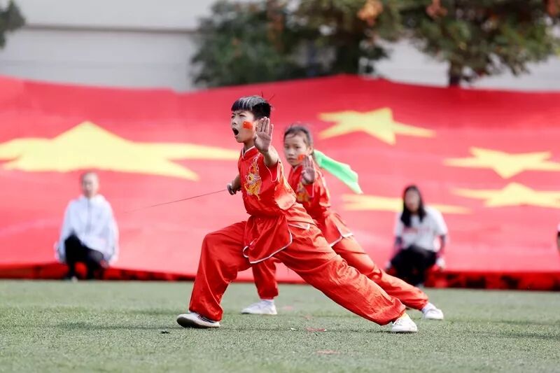 随后,学校的武术教练和武术队的同学们带来了精彩纷呈的表演。他们基本功扎实,每一个动作都刚劲有力,集体拳虎虎生风,刀枪剑刚柔并济,舜娃强红旗猎猎。形式多样的表演不仅是舜娃们平时勤学苦练的结果,也彰显着学校关注每一个、发展每一个的生态化教育理念。