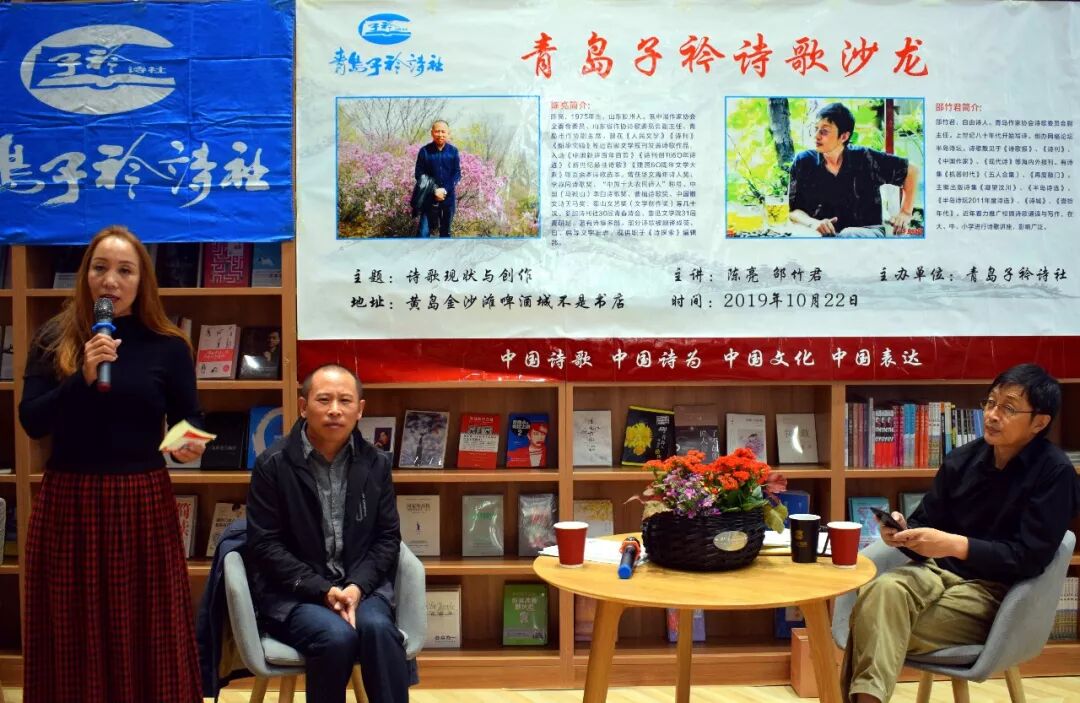 10月22日下午,青岛西海岸新区子衿诗社在青岛西海岸新区金沙滩啤酒城“不是书店”举办了“子衿诗歌沙龙”活动。这次诗歌沙龙的主讲嘉宾有中国作协全委会委员、山东诗歌创作委员会副主任、青岛作协副主席、《诗探索》编辑部主任陈亮,青岛作协诗歌创作委员副主任邵竹君,诸城市作家协会副主席胡文彬。其间诗歌爱好者们朗诵了自己的诗歌。陈亮与邵竹君老师分别谈“中国诗歌现状”与“青岛诗歌现状”并现场点评诗友们的作品。陈亮主席还特别强调要继承和研究三个传统文化 。他们在总结时对这次活动给予了高度的评价,一致说:这次诗歌沙龙活动是一次非常成功的活动,时间之长;人员之多;氛围之浓厚是前所未有的。此次沙龙活动诗意氛围浓厚,且诗与音乐相融。“听了两位老师讲解诗歌,聊诗歌文化,受益匪浅。”很多诗歌爱好者们纷纷表示。区文联分管领导也参加了沙龙,表示将一如既往支持文学社团规范化运营。事后西海岸新区文联做了公众号为之宣传。子衿诗社社长崔子衿告诉记者,“诗歌永远是我们的一种精神坚守!希望通过举办这样的沙龙活动,提高诗歌爱好者的创作水平,写出更多更好的诗歌来。”半岛都市报记者丁霞在《半岛都市报》西海岸新区新闻版做了详细的报道。