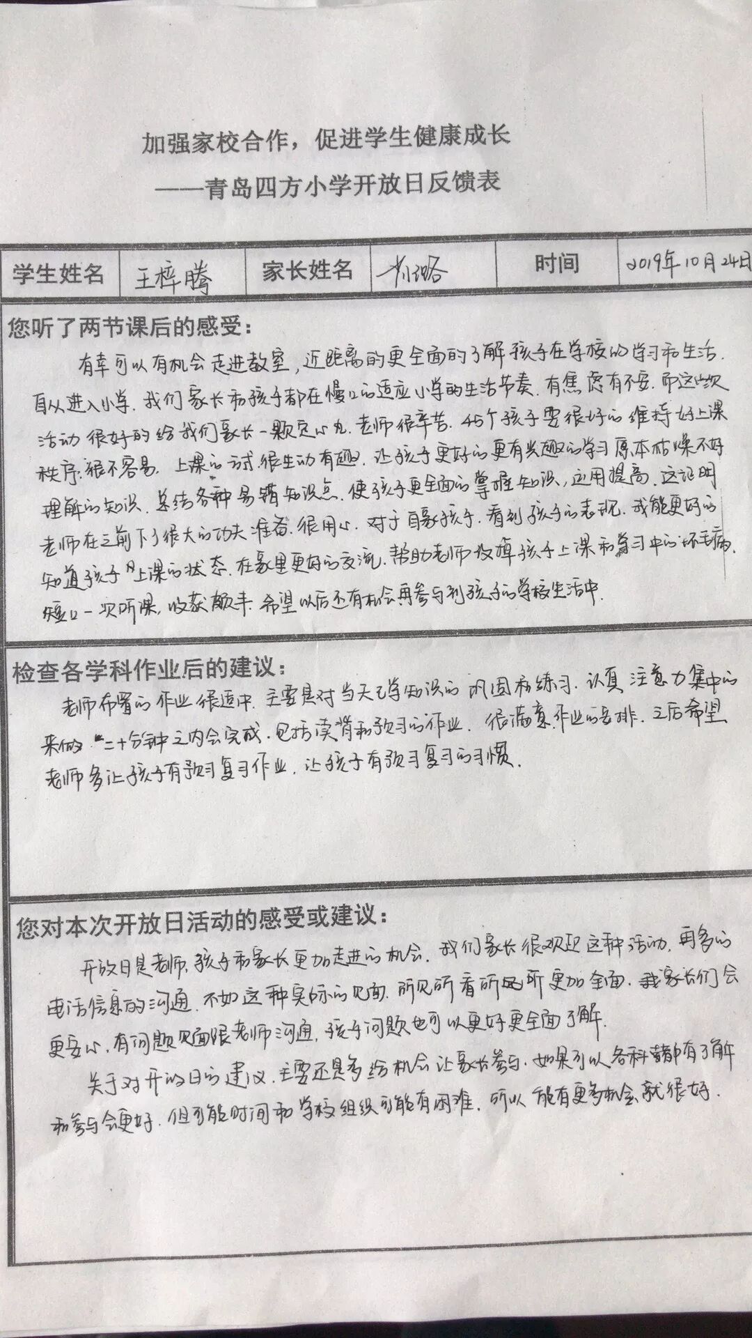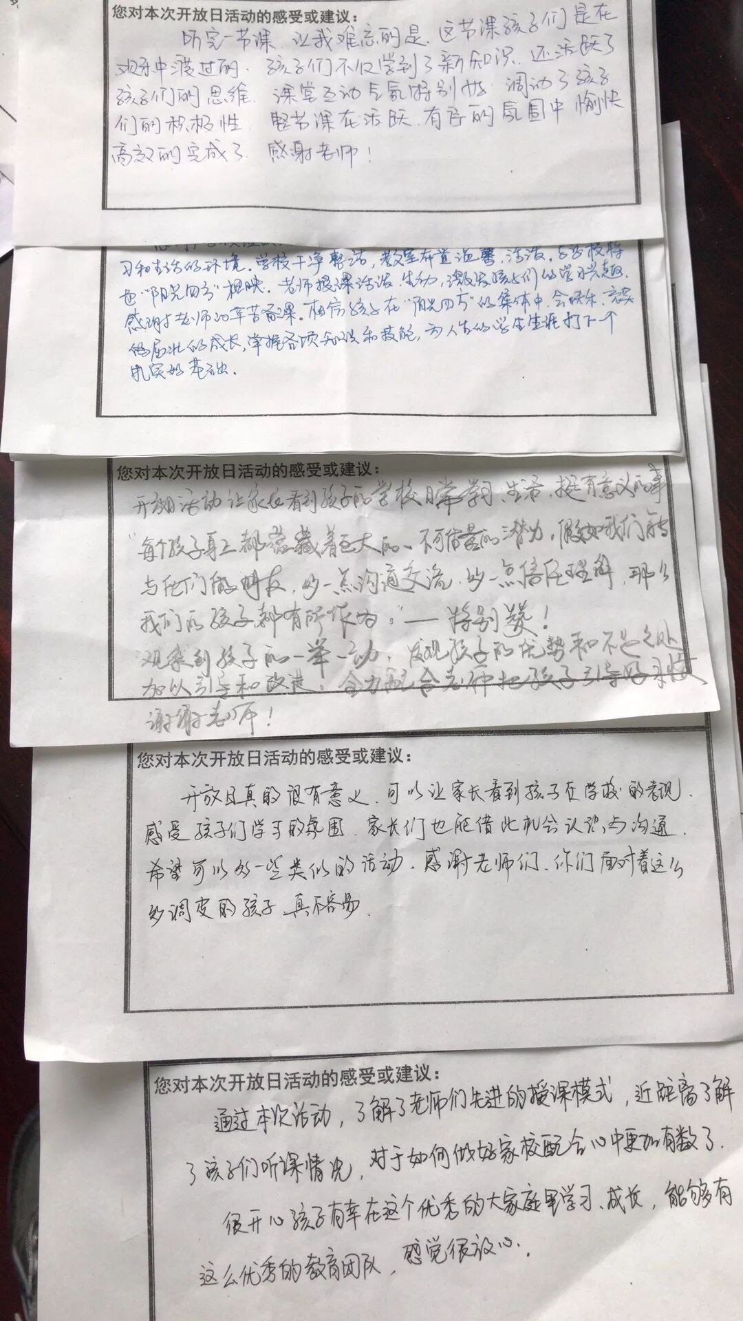 半天的活动结束后,家长们还认真填写了学校下发的听课反馈表,对教师执教情况和学校工作提出了自己的意见。从家长填写的“家长开放日”反馈表中的统计结果看,满意度达99%以上。家长们普遍对老师的教学工作表示满意,并表示意犹未尽,应该多开展类似活动。
