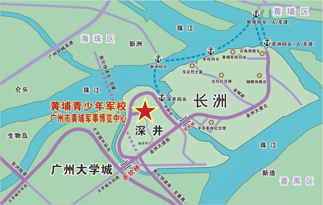 9、请认准唯一校址(广州市黄埔区长洲岛深井村岐西坊20号);驾车交通指引:进入大学城后往长洲方向行驶,行至大学城和长洲岛之间的“赤坎桥”, 下桥时切记减速并注意找到位于桥头左侧的路口,然后左转掉头驶入,继续沿着河涌堤坝路前行约2公里抵达黄埔青少年军校;如有导航可先设置目的地为“赤坎桥”。