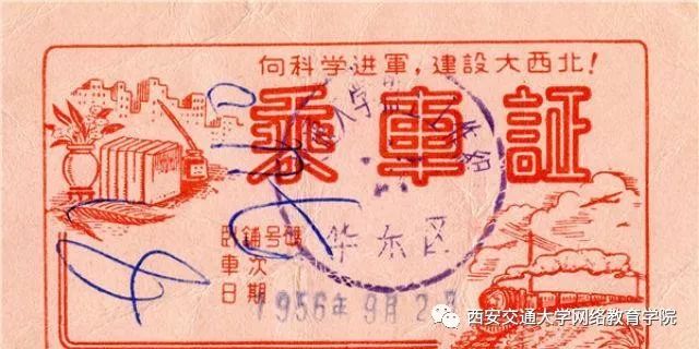 1956年交大师生西迁时所使用的乘车证,正面印有“向科学进军,建设大西北!”的字样(资料照片)