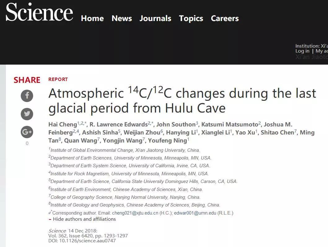 北京时间2018年12月14日,《科学》杂志刊登了西安交通大学全球环境变化研究院程海教授等的最新研究成果——葫芦洞石笋记录的末次冰期大气14C/12C变化(Atmospheric14C/12C changes during the last glacial period from Hulu Cave)。