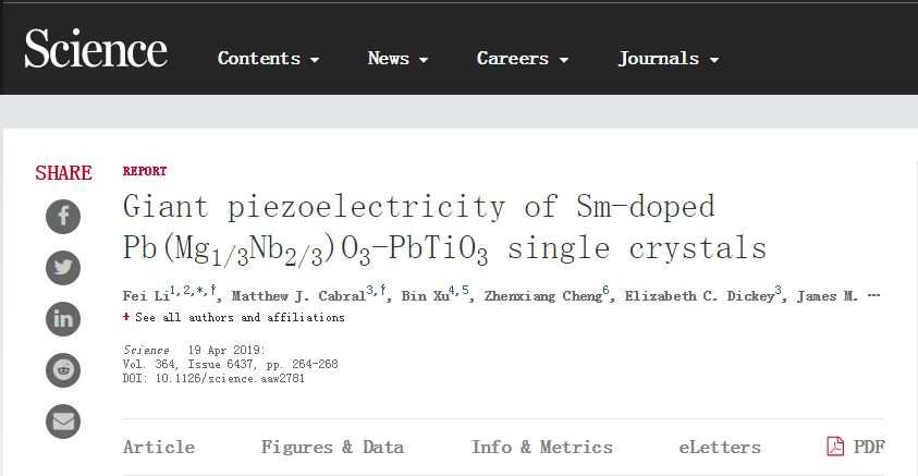 北京时间2019年4月19日,西安交大研究团队(西安交通大学为第一单位)与美国宾夕法尼亚州立大学、澳大利亚伍伦贡大学、美国北卡州立大学等单位合作,在Science 在线发表题为“Giant piezoelectricity of Sm-doped Pb(Mg1/3Nb2/3)O3-PbTiO3 single crystals”的研究论文,在弛豫铁电单晶材料高性能化研究方面取得了重大突破。