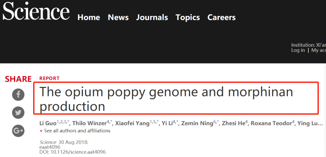 北京时间2018年8月31日,西安交通大学叶凯青年科学家工作室团队、英国约克大学Ian Graham院士团队、英国Sanger研究所宁泽民研究员合作的学术论文“The opium poppy genome and morphinan production”在《科学》杂志发表。