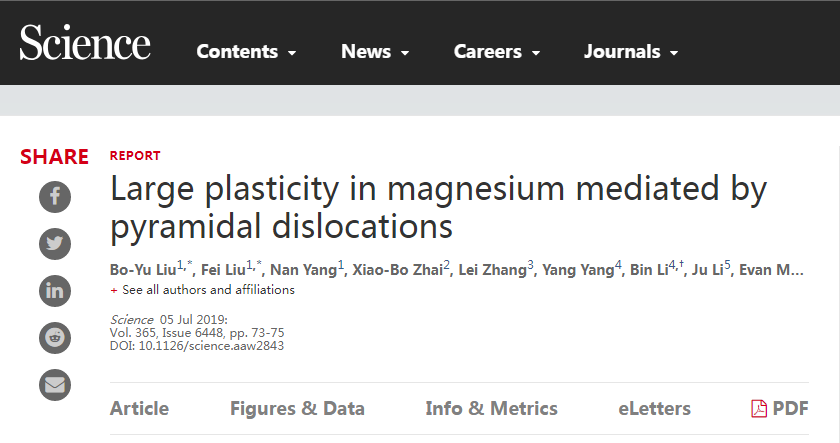 北京时间2019年7月5日,《科学》杂志刊发西安交通大学单智伟教授团队最新研究成果:塑性差并不是镁的固有属性,通过提高流变应力(如通过细化晶粒或提高应变速率)来促进位错形核和滑移,可能是行之有效的增塑方法。