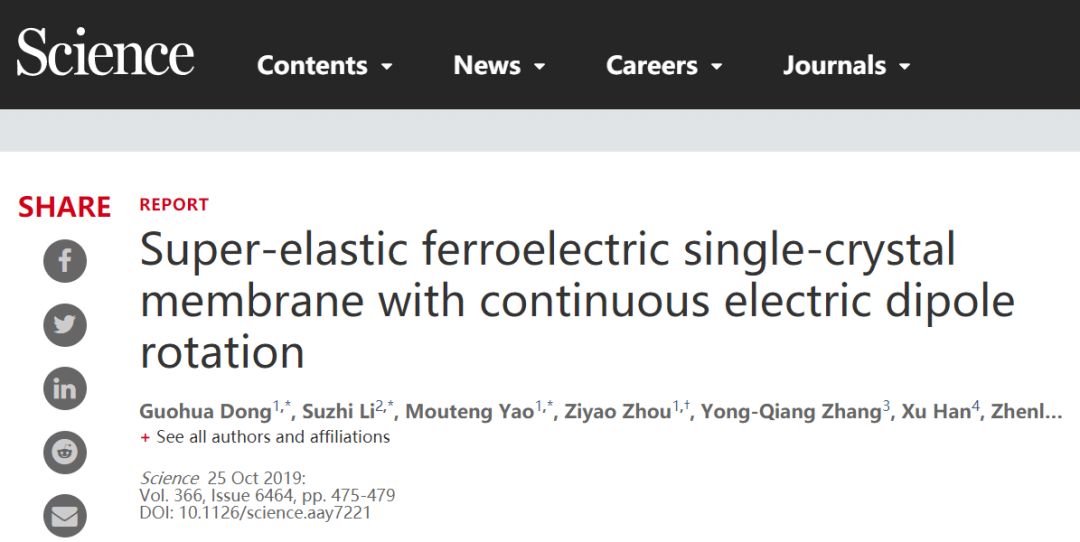 Super-elastic ferroelectric single-crystal membrane with continuous electric dipole rotation《具有连续电偶极旋转的超弹性铁电单晶薄膜》。