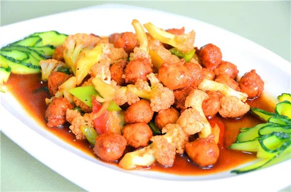姜葱大虾菜花烧丸子手撕包菜主食:芝麻米饭汤羹:皮蛋豆腐汤