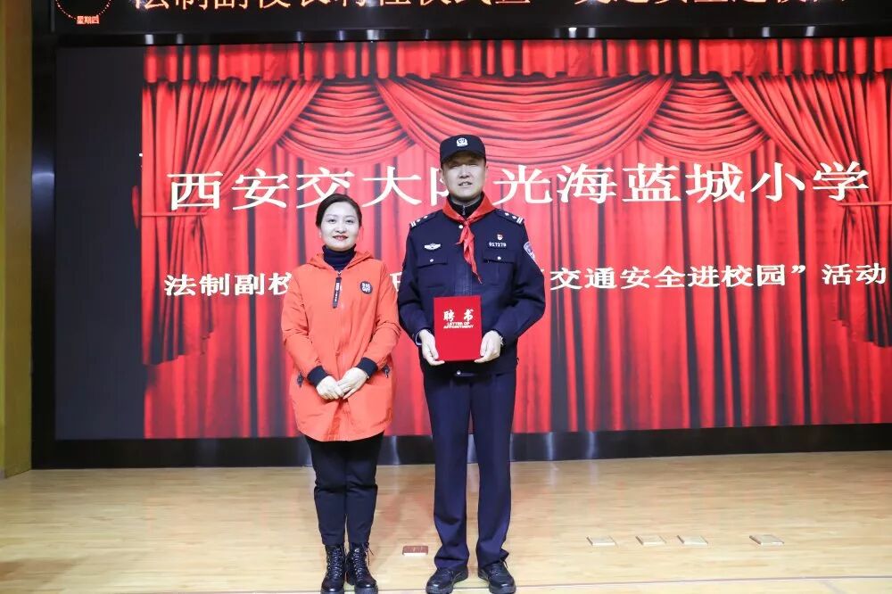 在法制副校长聘任仪式上,西安交大阳光海蓝城小学白雁校长为辛家庙派出所副所长马哲同志颁发法制副校长聘书。