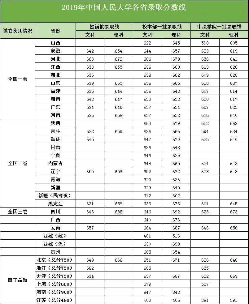 一直以来人大高考录取分数线居高不下,是除清北以外,关注度最高的高校之一。下面我们看看中国人民大学2019年在各省市的录取分数线: