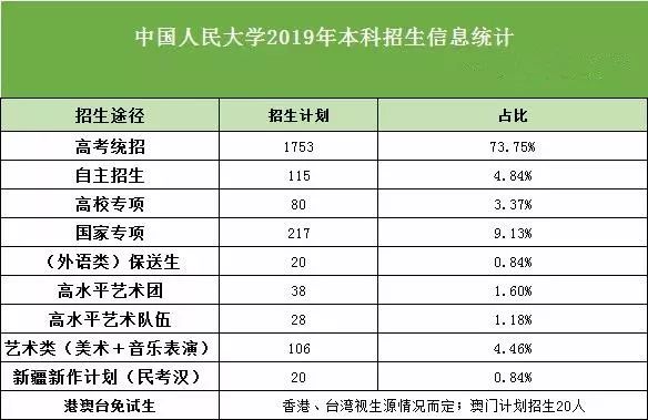 2019年中国人民大学招收本科生3062人,包括高考统招和各种特殊类型招生,特殊类型招生包括自主招生、高校专项计划(圆梦计划)、保送生、高水平艺术团、高水平运动队、艺术类、内地西藏班、内地新疆高中班、新疆协作计划(民考汉)、港澳台侨生等。详见下表: