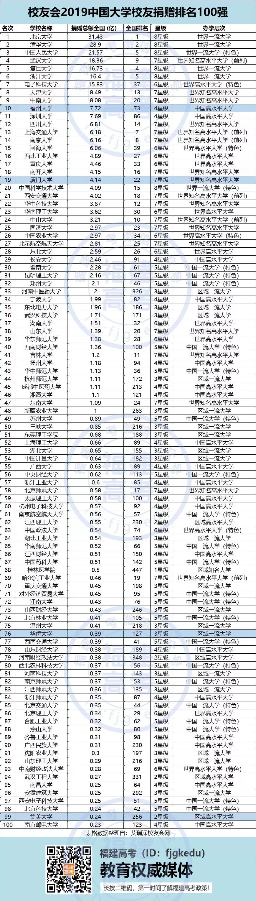 直接上图!小编给大家带来由艾瑞深校友会推出的2019中国高校校友捐赠排行榜!福建有四所上榜,其中一所直接跻身前十!